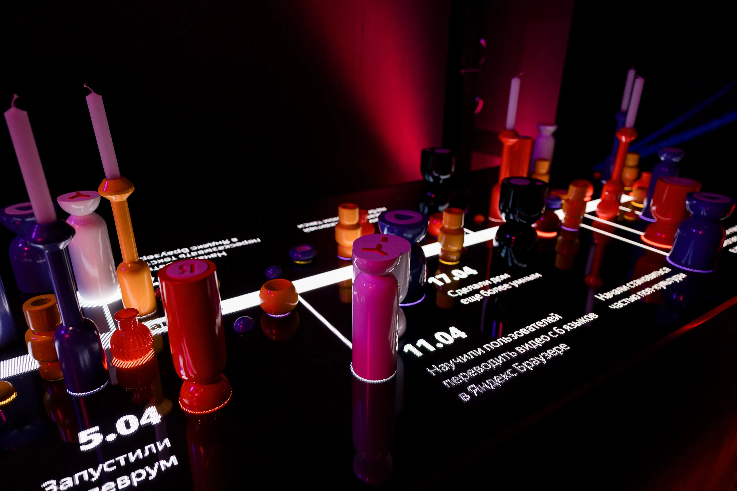Под руководством агентства Unity мы создали инсталляцию, взяв за основу таймлайн, который расположился на праздничном столе и продолжился на вертикальном экране вместе с трогательным и совсем не корпоративным видео о продуктах и запусках Яндекса за год. Гости праздника изучали таймлайн, пили «технологичные» коктейли и танцевали под дружественных DJ в стенах бара-фонотеки Flâner, который мы сопроводили светом, проекциями и контентом.